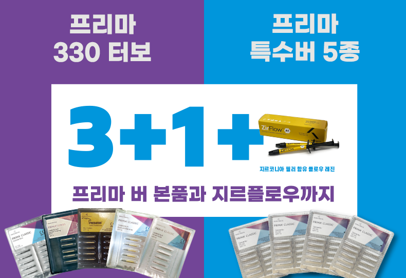 3+1+1 이벤트는 프로덴티의 대표 아이템을 중심으로 진행된다. 330 터보를 내세운 ‘프리마 오리지널 330 터보’ 3개 구매 시 본품 1개와 지르코니아 필러가 함유된 플로우 레진 ‘지르플로우(ZirFlow™)’가 추가로 증정된다. 또한 프리마 특수버 5종(△엔도 Z △메탈 컷팅 △카바이드 롱생크 △써지컬 △컴포짓 피니싱) 중 3개 구매 시 본품 1개와 지르플로우(ZirFlow™)를 증정하는 구성으로, 다양한 버를 합리적인 가격에 만나볼 수 있는 기회를 마련했다.